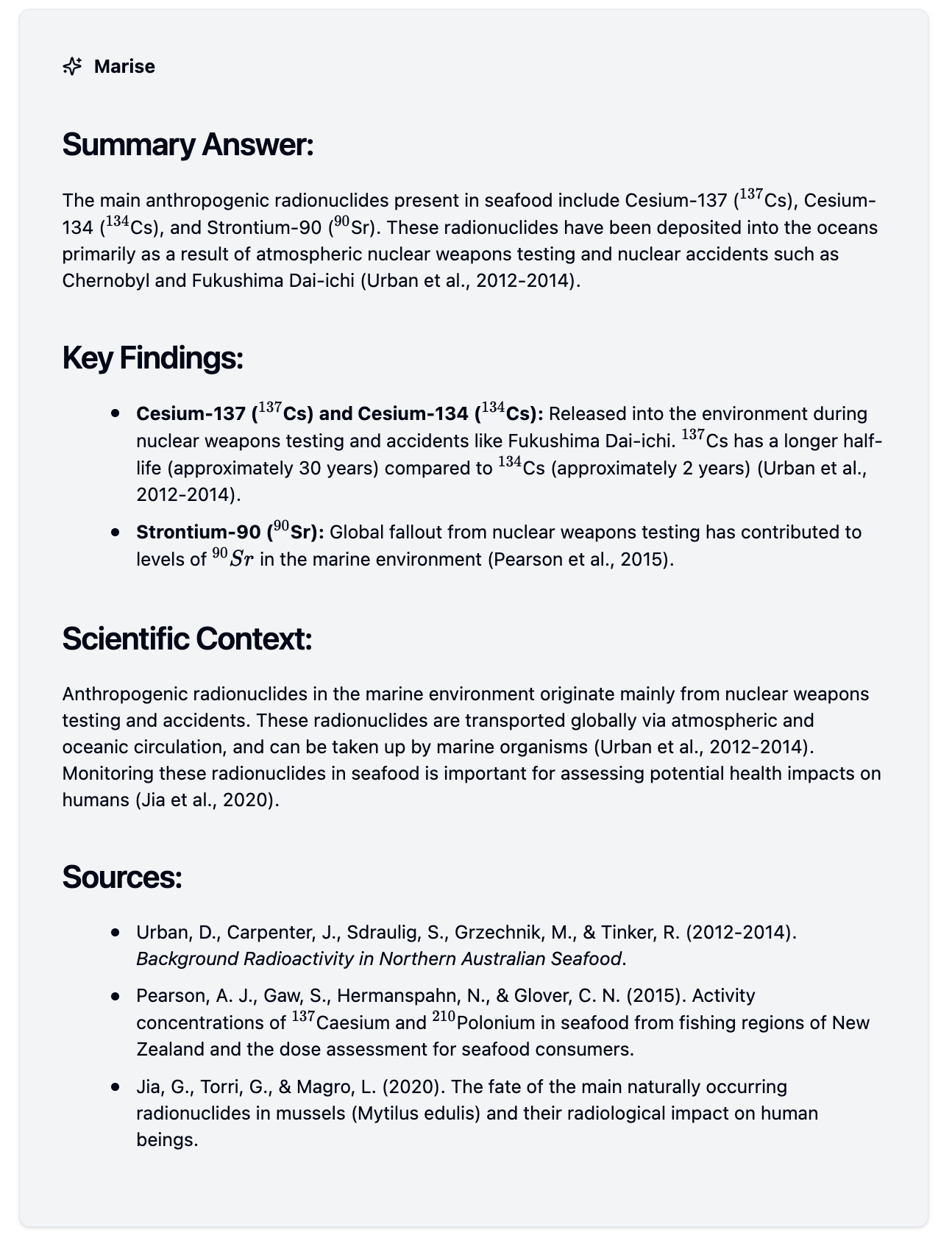 The challenge we faced was clear: How do we make this treasure trove of specialized scientific knowledge accessible to everyone who might need it? A government official with no scientific background might need to understand radioactivity trends in their coastal waters. A marine biologist might need detailed information about specific isotopes in certain species. A student might be researching environmental impacts of nuclear energy.