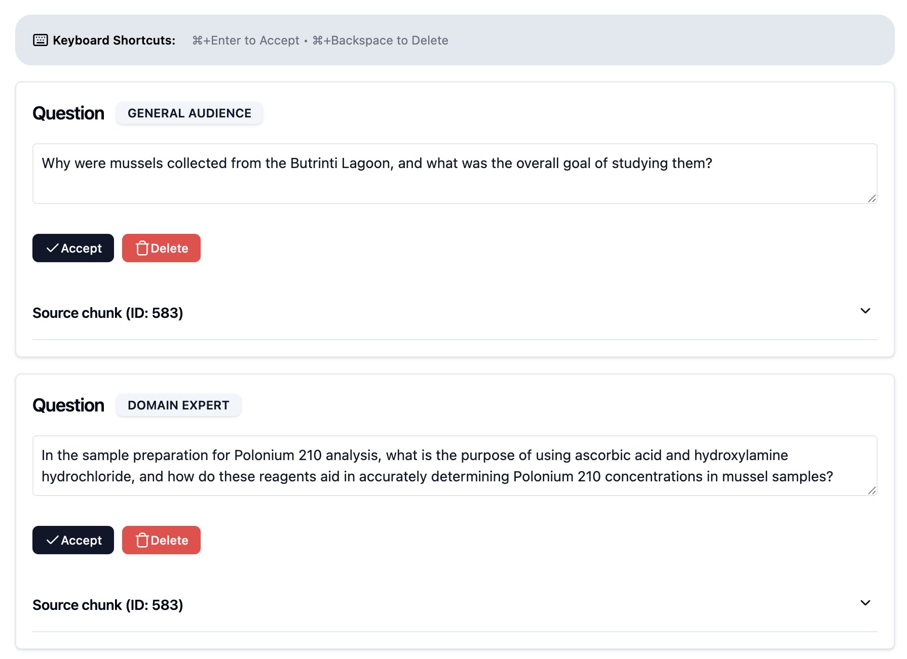Each synthetic question is paired with its source chunk as the ground truth - the chunk that should ideally be retrieved when this question is asked. Authorized users can then review and refine generated questions as shown in Fig. 1: