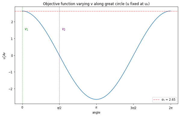 A = np.array([[1, 2, 0], [0, 1, 2]])U, sigma, Vt = np.linalg.svd(A)# Extract singular vectorsv1, v2 = Vt[0], Vt[1] # rows of Vt are the right singular vectorsu1, u2 = U[:, 0], U[:, 1]# Parameterize great circle through v1 and v2t = np.linspace(0, 2*np.pi, 200)v_circle = np.array([np.cos(t_i) * v1 + np.sin(t_i) * v2 for t_i in t])# Compute objective along this circleobjective = [u1 @ A @ v for v in v_circle]fig, ax = plt.subplots(figsize=(10, 6))ax.plot(t, objective)ax.set_xlabel('angle'); ax.set_ylabel(r'$u_1^T A v$')ax.axhline(sigma[0], color='r', linestyle='--', alpha=0.5, label=f'σ₁ = {sigma[0]:.2f}')ax.axvline(0, color='green', linestyle=':', alpha=0.7)ax.axvline(np.pi/2, color='purple', linestyle=':', alpha=0.7)ax.text(0.1, 1.5, r'$v_1$', color='green', fontsize=12)ax.text(np.pi/2+0.1, 1.5, r'$v_2$', color='purple', fontsize=12)ax.set_xticks([0, np.pi/2, np.pi, 3*np.pi/2, 2*np.pi])ax.set_xticklabels(['0', r'$\pi/2$', r'$\pi$', r'$3\pi/2$', r'$2\pi$'])ax.legend()ax.set_title('Objective function varying v along great circle (u fixed at u₁)')plt.show()