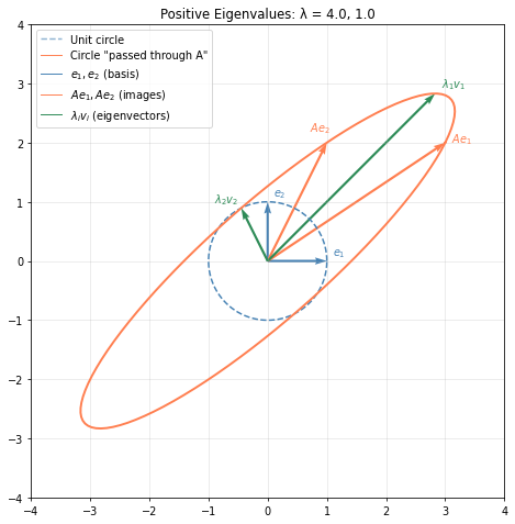 To see the essence, pass a unit circle through \(A\). Every point on the circle is a unit vector; its image shows how \(A\) stretches and rotates space. The circle becomes an ellipse. The eigenvectors point in directions where \(A\) acts by pure scaling, with no rotation. Along \(v_1\), space stretches by \(\lambda_1 = 4\). Along \(v_2\), it stretches by \(\lambda_2 = 1\).