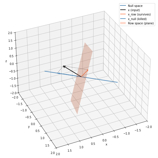 So \(Ax = Ax_{\text{row}}\). The null space component is silently erased. Only the row space projection determines the output. This is why information is “lost” when we squash dimensions; vectors that differ only in their null space component become indistinguishable after multiplication.
