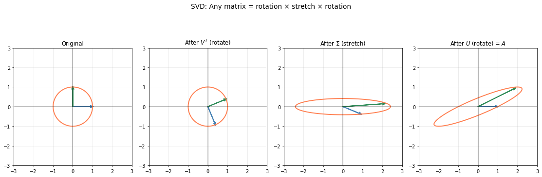 Note: We use a 2×2 matrix here for visualization clarity. With our 2×3 example, the input space is 3D (making the “rotate → stretch → rotate” harder to show in 2D plots). The geometric principle is identical: SVD always decomposes a linear map into rotations and axis-aligned stretching, but square matrices let us see all three steps in the same plane.